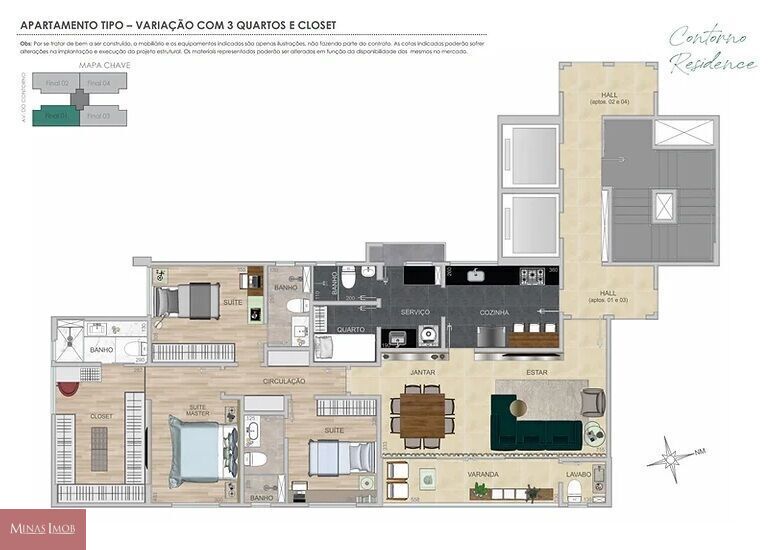 Com 130,94 m² de área interna, salão para dois ambientes amplos com varandão e lavabo, piso em mármore bege Bahia, 04 quartos com armários (marcenaria L’Idea), sendo 02 suíte e 02 semi suítes, rouparia no corredor, pisos da parte íntima em vinílico,