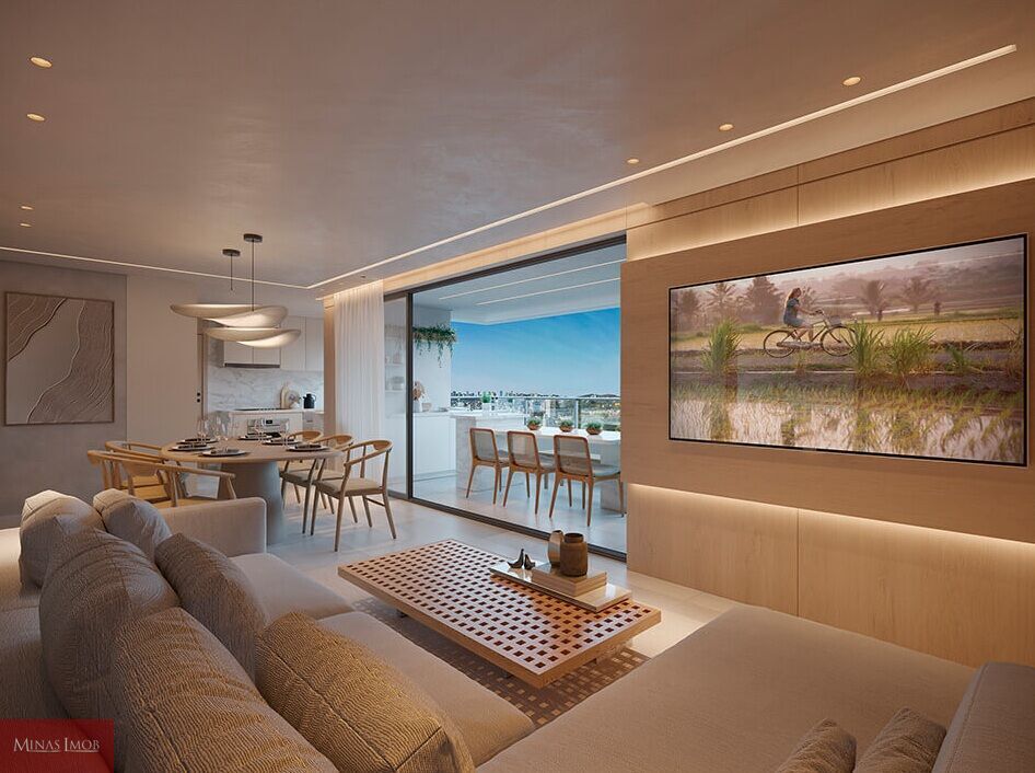 Amplas salas de jantar e estar integradas, com varanda